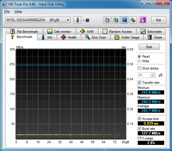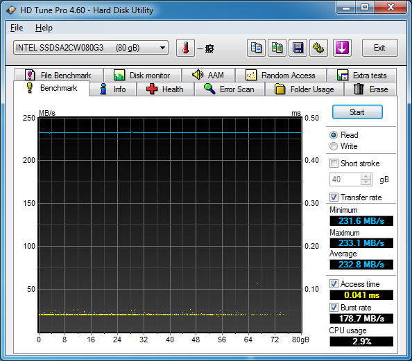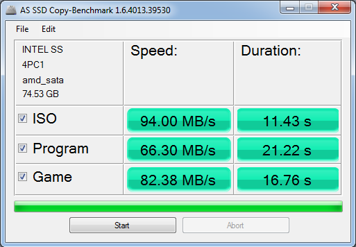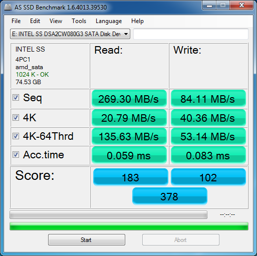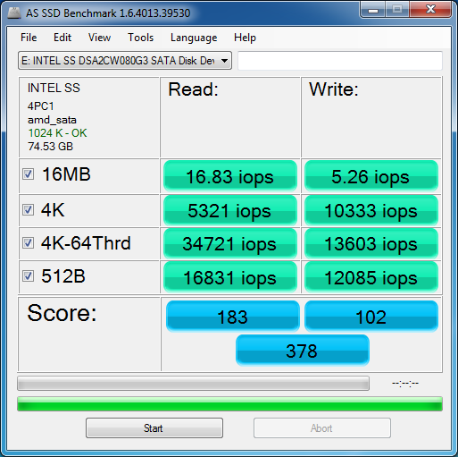 Немецкий тест, столь популярный у владельцев SSD. Измеряет скорость линейной записи и чтения, работу накопителя с блоками размером 4КБ, а также показывает время доступа устройства, тестирует IOPS и проводит тест копирования. Так как бенчмарк сравнительно новый, тут не будет сравнения с X25M-G2.