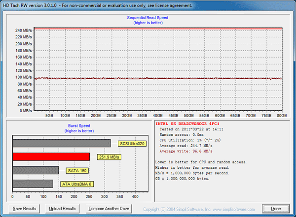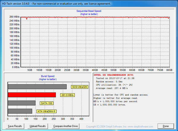 В этом тесте также победил SSD предыдущего поколения - его показатель чтения равняется 257.4МБ/с против 244.7МБ/с. Говоря откровенно, уже начинаю жалеть что не купил X25M-G2 ещё много месяцев назад, когда они довольно дёшево (250 долларов за 120ГБ модель) продавались на ebay