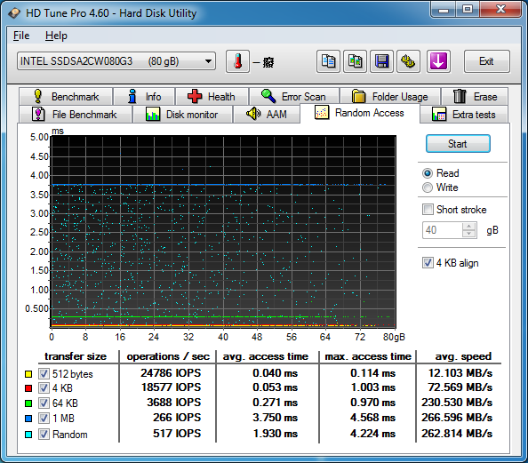 Данный тест может показывать положение дел и с чтением и с записью (как большими блоками по 2МБ, так и мелкими - по 4КБ), плюс способен измерением IOPS нас порадовать.