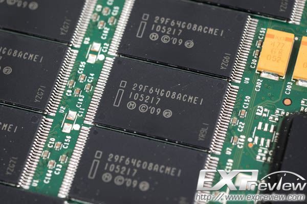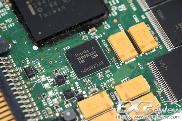 На передней стороне печатной платы твердотельного накопителя находятся десять чипов памяти, той самой - MLC NAND Flash, изготовленной по нормам 25нм тех.процесса. От души надеюсь, что ужасы, рассказываемые о такой памяти (подробнее можете почитать в этом материале где-то во введении, т.е. на первой странице) не устроят проблем будущим владельцам девайса. На обратной стороне платы (нижнее фото) видны места для большего количества чипов флеш-памяти (сии места не будут пустовать у 600ГБ версии SSD