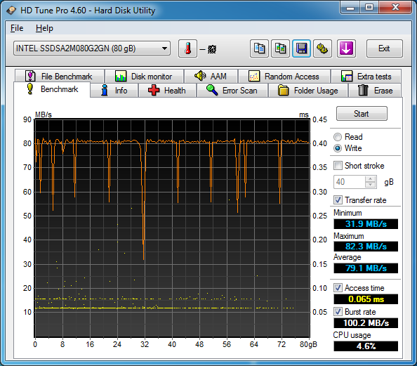 Если бы не ограничение по скорости записи у 80ГБ модели, то картинка была бы намного интереснее. Для сравнения нам приводят скриншот из этого же теста, но проводимого с 80ГБ версией X25-M (не указано - G1 или G2):