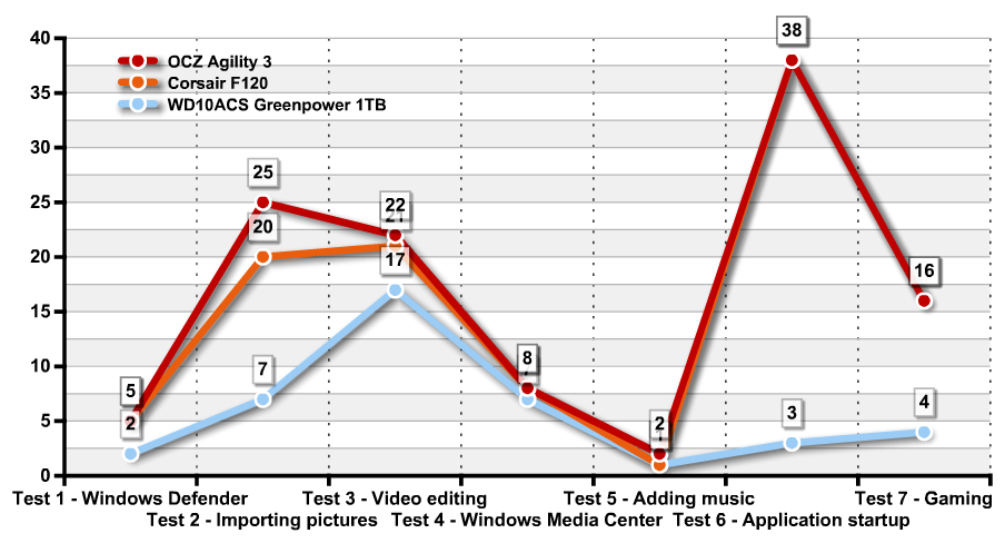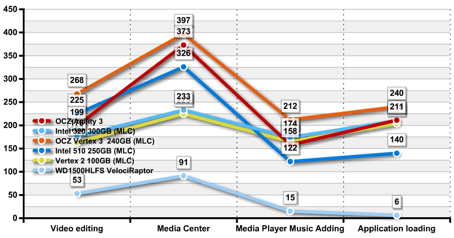 Т.к. тест новый, имеются результаты только по одному SSD, помимо Agility 3. Как видно, новый продукт OCZ несколько быстрее накопителя от Corsair, но разницу в производительности нельзя назвать значительной.