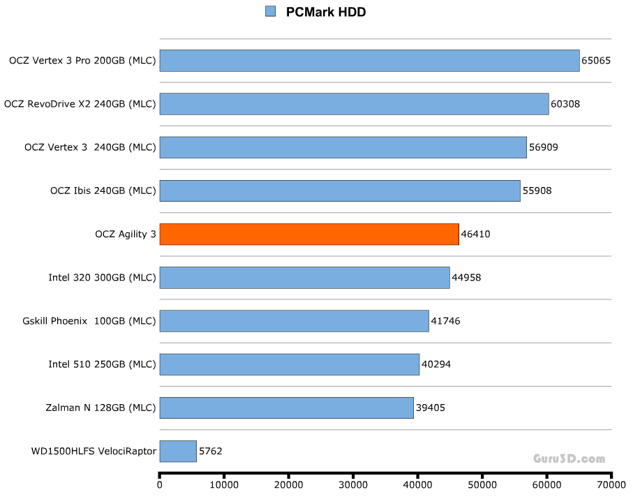 Данный тестовый пакет использует иную, отличающуюся от других систему проведения замеров производительности. Скорее всего, в виду этого авторы с Гуру3Д никогда не получали при тестировании результаты, равные заявленным скоростям. Такова природа теста. Замечательный результат мы видим у тестируемой новинки, относительно недорогой SSD занял второе место в тесте.