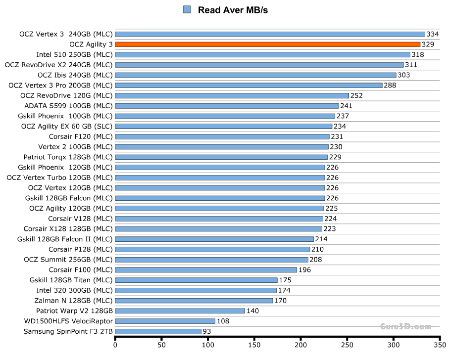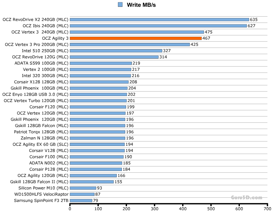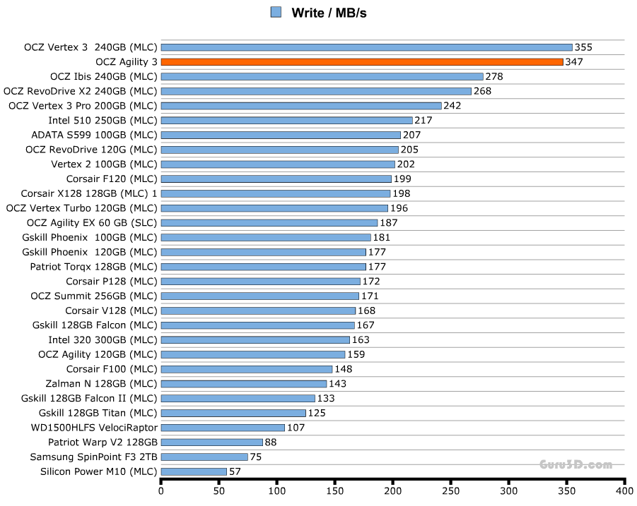 В этом тесте Intel'овский SSD смог показать скорость ~317МБ/с, когда как у Agility 3 этот же показатель оказался в районе 352МБ/с (а у Vertex 3 - 419МБ/с).