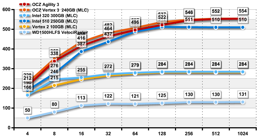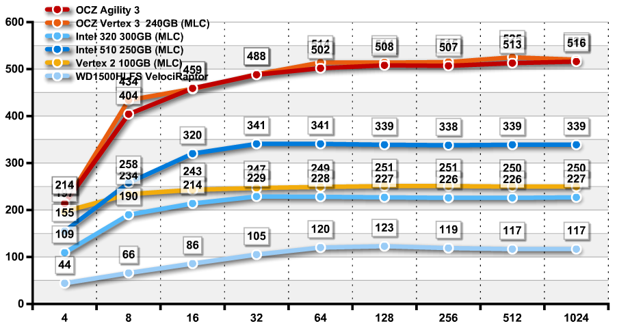 Наиболее сложным и важным заданием для любого устройства хранения данных является... быстрая запись очень маленьких файлов. Было проведено тестирование с блоками размером от 4 до 1024 килобайт в файле общим объёмом 256 мегабайт. Результаты Agility 3 очень неплохие - второе место после Vertex 3.
