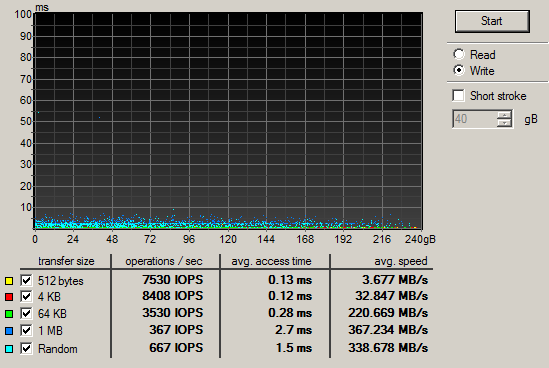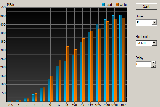Суть теста - файл объёмом 64 мегабайта записывается блоками разного размера - от 0.5 килобайт до 8 мегабайт. В данном тесте почти всегда можно увидеть соответствие заявленных характеристик действительным, этот раз - не исключение.