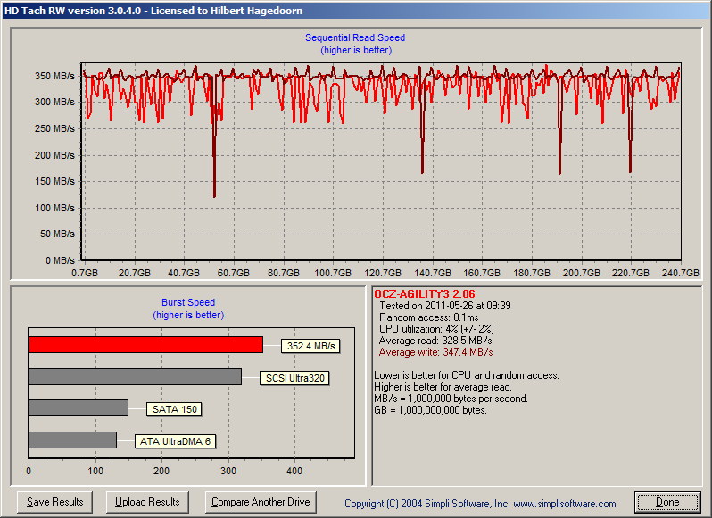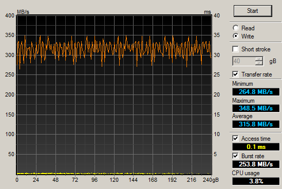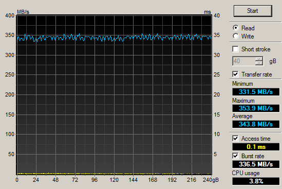 Довольно-таки неплохой результат - пиковая скорость в 353МБ/с и средняя в 343МБ/с, для сравнения - обычный винчестер в этом тесте показывает порядка 45-65МБ/с, а Velociraptor - 100-120МБ/с.