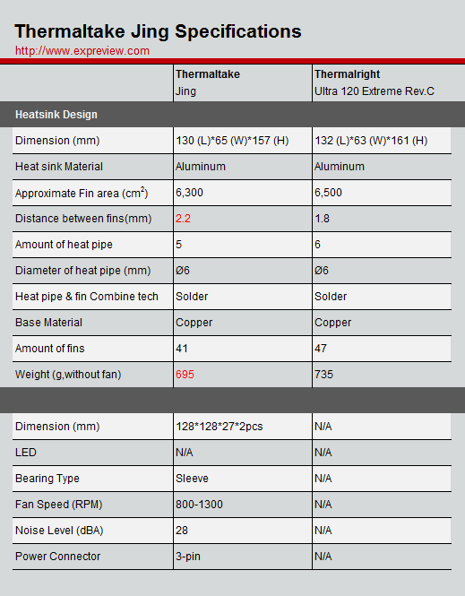 На слайде ниже можно рассмотреть характеристики Jing более подробно, а также освежить в памяти оные у его соперника в сегодняшнем тестировании, продукта от Thermalright - Ultra 120 Extreme Rev.C.