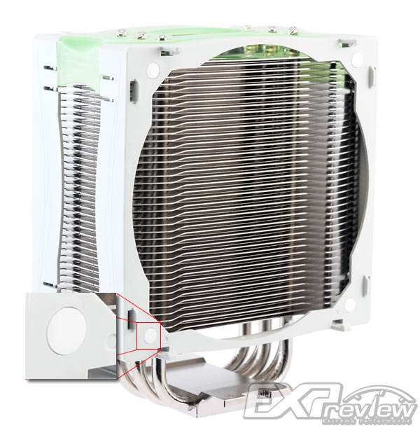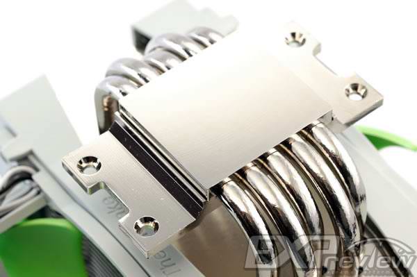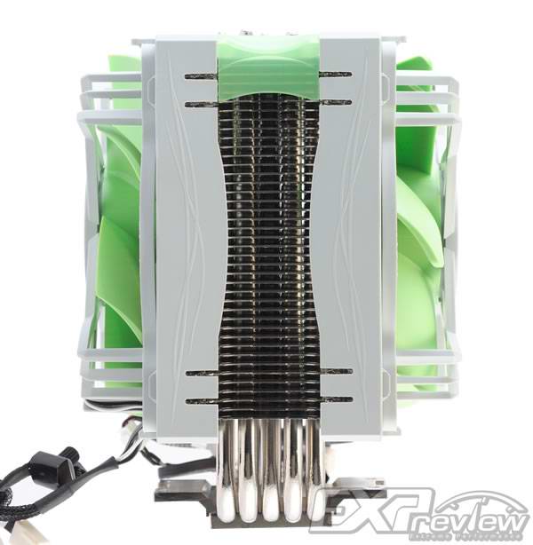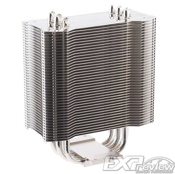 Полюбуемся на "раздетого" Jing'а. Основание радиатора медное и никелированное, теплотрубок пять штук, толщина каждой - 6 миллиметров. Количество алюминиевых рёбер вентилятора - 41, общая площадь рассеивания тепла - 6300 квадратных сантиметров. Авторы обзора отмечают, что расстояние между рёбрами радиатора составляет 2.2мм, что даёт возможность даже низкооборотистому вентилятору хорошо продувать конструкцию, а главное - без лишнего шума.