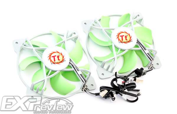 А вот и необычные вентиляторы "Тихони" от Thermaltake. Скорость вращения их лопастей находится на уровне 1100-1400 оборотов в минуту. Заботливый производитель положил в комплект кулера регуляторы скоростей вентиляторов, так что любители тишины могут чуть снизить обороты "карлсонов" - до 800-1300об/мин.