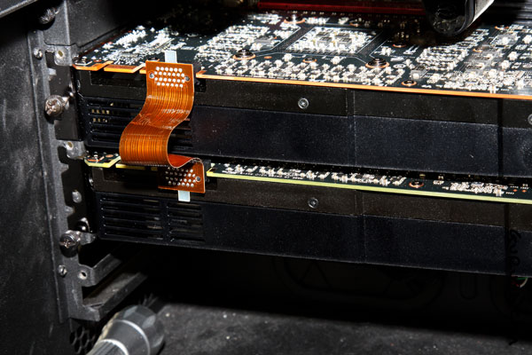 На фотографии выше видно, каким образом соединяются карточки при помощи SLI-мостика.