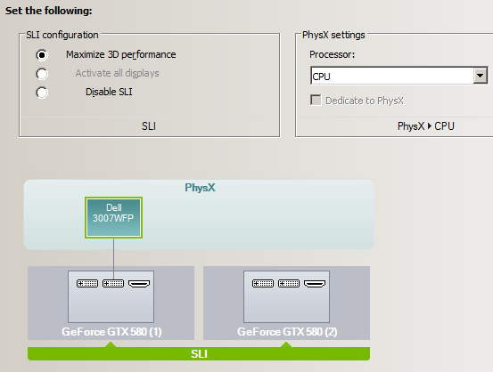 Далее автор статьи с Гуру3Д делится "тайным знанием" о том, как же активировать SLI. Говорит, мол, необходима материнская плата, совместимая со SLI (так или иначе, т.е. прямо от производителя или же кустарными методами), две GTX570 и SLI-мостик, дабы карточки соединить между собой. После этого достаточно поставить новую версию драйверов и в их настройках произвести следующие манипуляции: