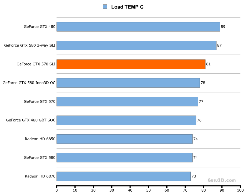 В тестировании двух GTX580 было 6 децибел разницы между работой видяхи в одиночном режиме и в SLI, у GTX570 дела лучше - всего 2 децибела разницы. Хорошо, если это правда.