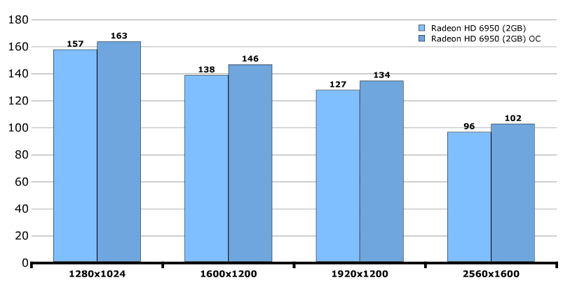 График ниже наглядно показывает, насколько разгон улучшил производительность Radeon HD 6950 в Call of Duty: Modern Warfare 2 (4xAA 16xAF):