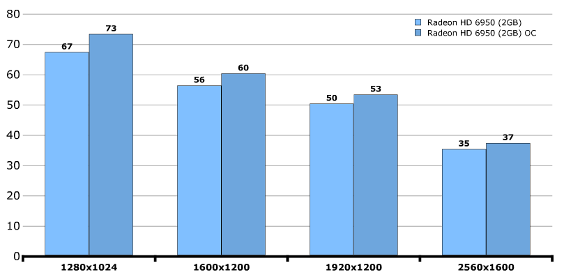 В разгоне HD 6950 демонстрирует почти такую же производительность, как 6970 в номинальном режиме.