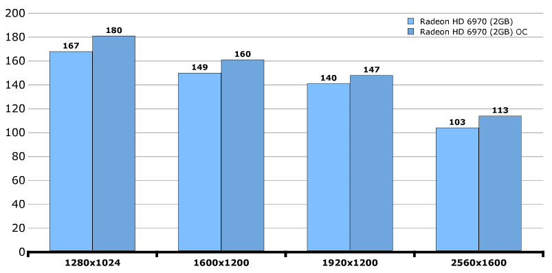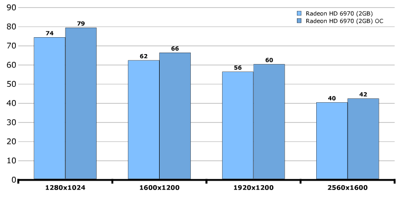 В разгоне HD 6970 обогнала и свою основную соперницу в лице GTX570 и много кого ещё, уступив лишь GTX580 и "двухголовому старичку" 5970. Очень неплохой результат, особенно учитывая разницу в цене между GTX580 и 6970.