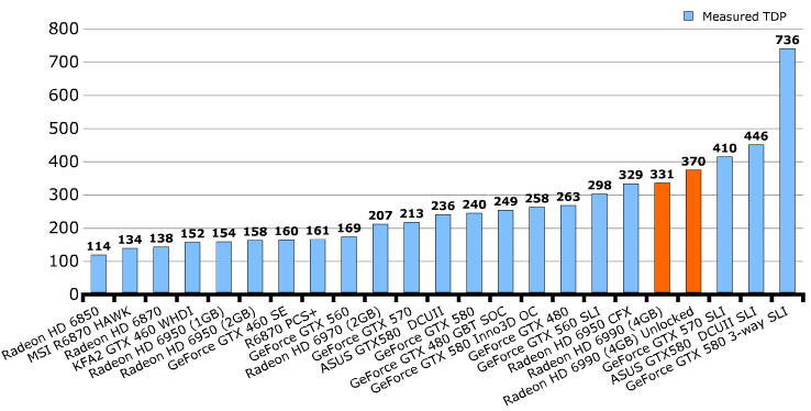 Ужасающих 415/450 (указано максимальное энергопотребление в OC-режиме, взятое из разных источников) ватт мы не увидели и это очень радует, впрочем не стоит забывать о том факте, что карточка была загружена игрой, а не FurMark, в котором из видяшки бы выжались все соки и энергопотребление значительно бы повысилось (возможно, что как раз до тех величин, что были указаны в спецификациях).