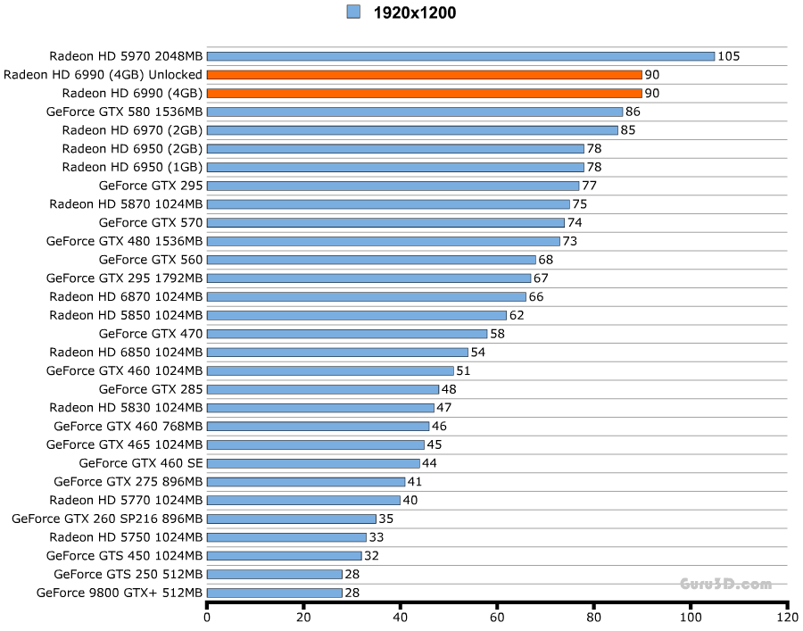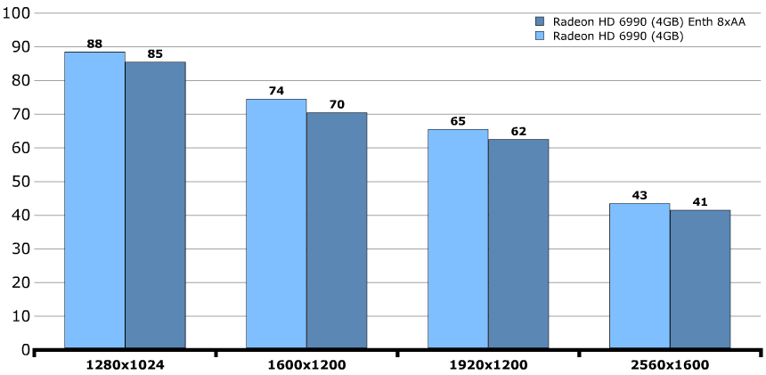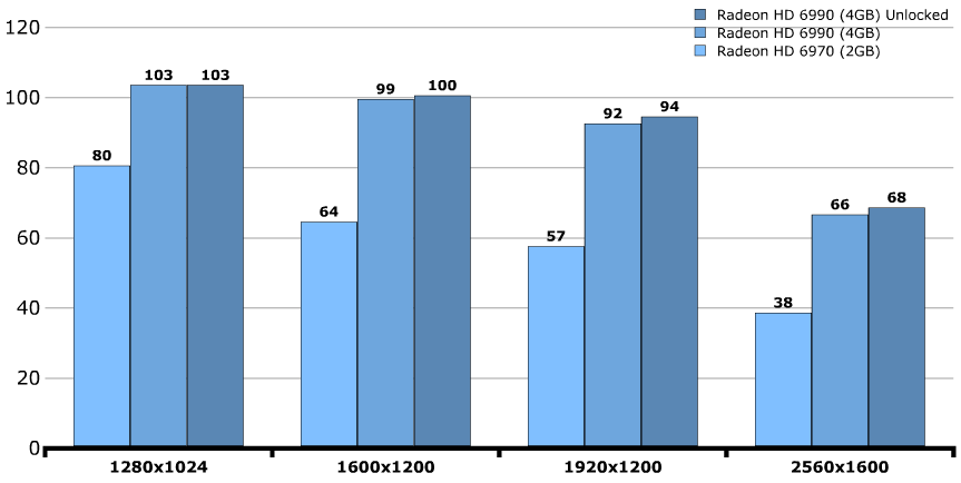 Владельцам HD 6990 рекомендуют выкручивать все настройки игр на максимум, силы видеокарты хватит на все электронные развлечения в разрешении до (и включительно) 1920х1080. При этом многие игрушки прекрасно (FPS выше 60) работают и на 2560x1600 в максимальном качестве. Что касается приложений, не поддерживающих мульти-GPU графические карты, то они достаточно стары, чтобы не показывать количество кадров в секунду ниже 90 (в пример приведены Anno 1404 и COD: MW 2).