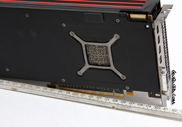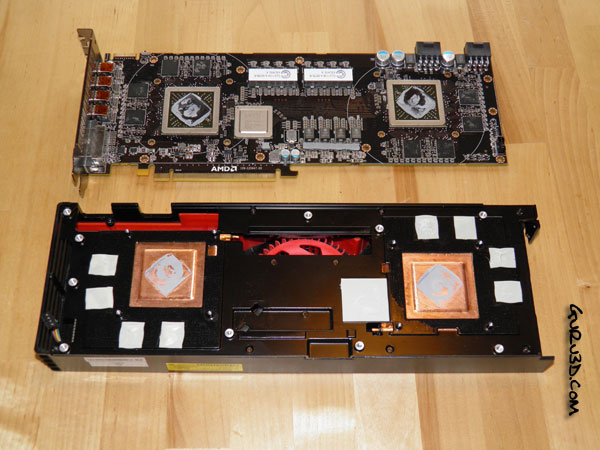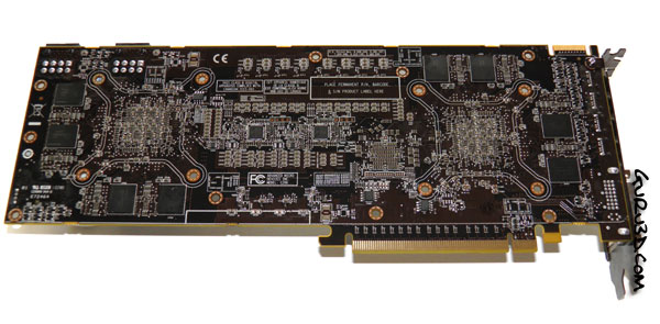 Перевернув карточку обратной стороной вверх, можно понять расположение графических чипов (парочки Cayman XT) - они располагаются за четырёхугольными металлическими защитными пластинами.