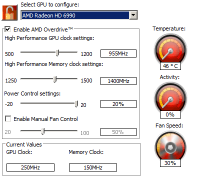 Далее нам рассказывают, что для разгона Radeon HD 6990 необходимо задавать частоты для каждого из графических ядер видеокарты, если используется ATI Overdrive.
