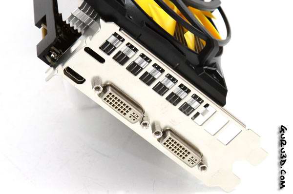 Видеовыходы те же самые, что и у референсного образца GTX460 - пара DVI и mini-HDMI. Автор статьи отмечает, что горячий воздух не выбрасывается наружу корпуса, так что владельцу придётся позаботиться о хорошей вентиляции своего системного блока.