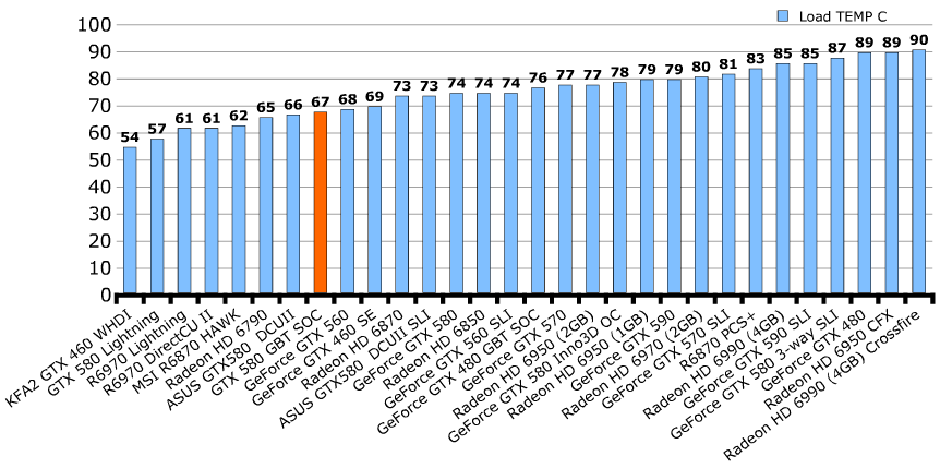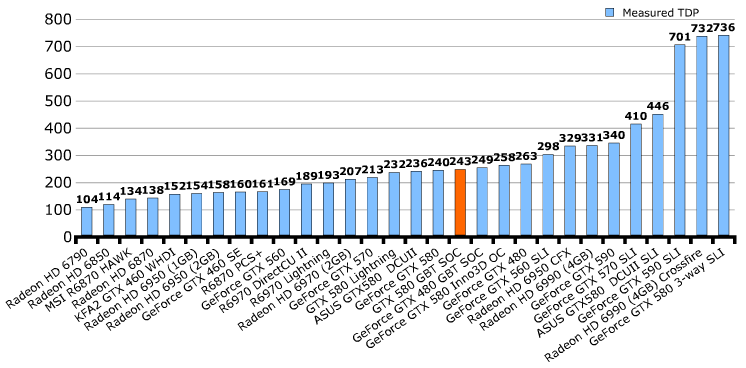 На графике ниже мы сможем сравнить показатели энергопотребления новенькой карты на базе GTX 580 от Gigabyte с её (GTX 580) вариантами от других производителей (и не только!):
