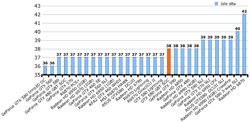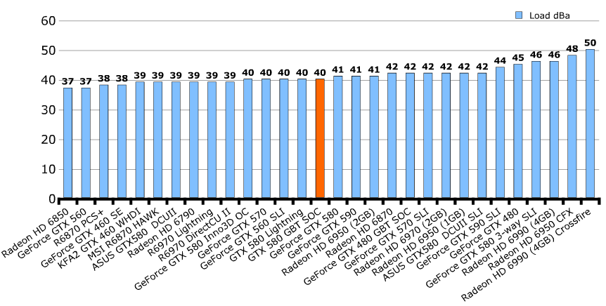 Уровень шума, издаваемый системой охлаждения видеокарты Gigabyte GeForce GTX 580 Super Overclock