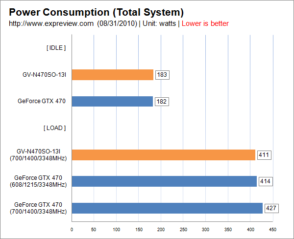 В режиме простоя, напряжение на ядре карточки падает до 0.875 вольт, а частоты до 50/101/135МГц. С референсной GTX470 ситуация точно такая же и энергопотребление практически не отличается.