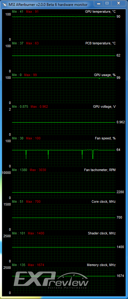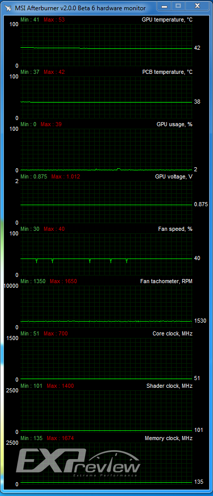 Замеры происходили после загрузки Windows 7, посредством мониторинга утилиты MSI Afterburner v2.0.0 B6. Обозреватель дожидался пока температура карточки стабилизировалась и делал записи (скриншоты в нашем случае), так он получил температуру в простое. А в нагрузке он делал всё тоже самое, но используя FurMark 1.8.2. Во время тестирования комнатная температура была 24 градуса по Цельсию.