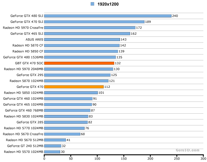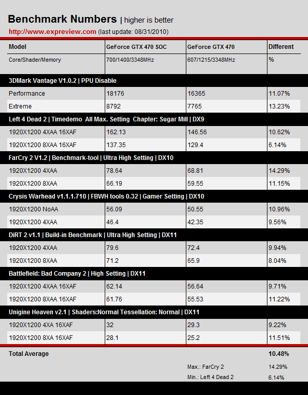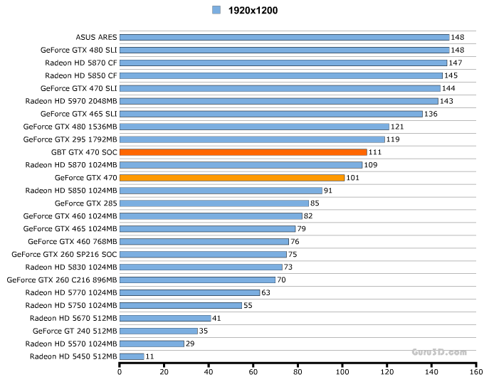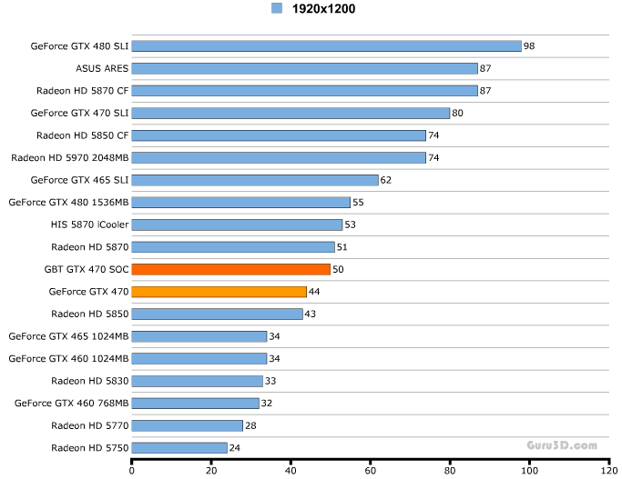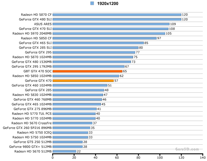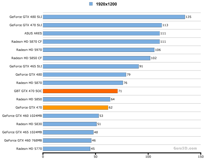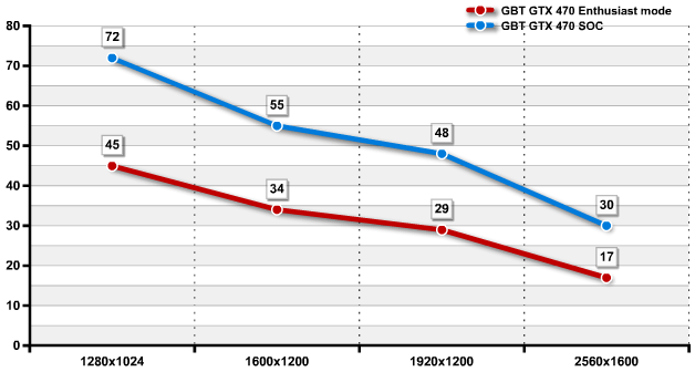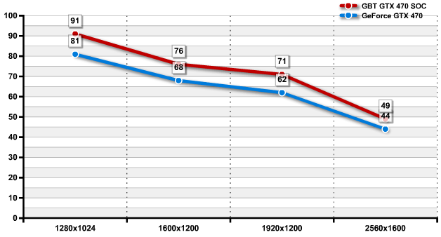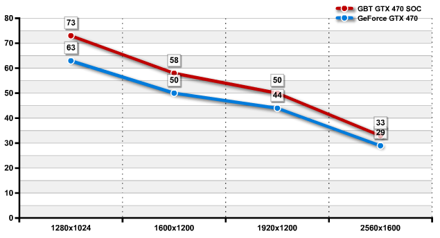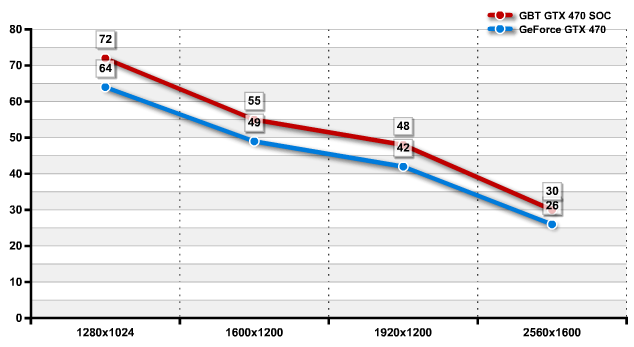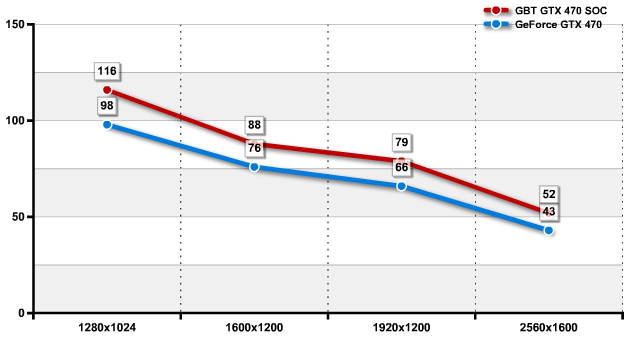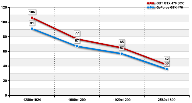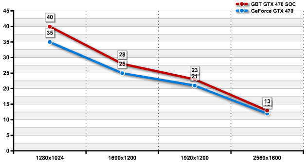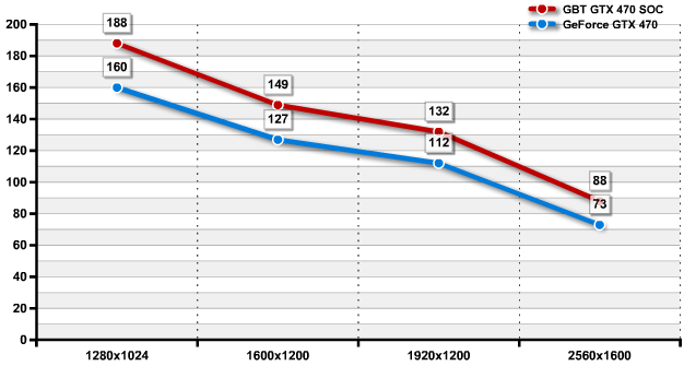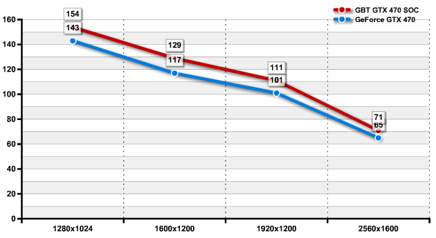 Средний процент преимущества GTX470 Superclock Edition над референсной картой - 10.48%. Наивно было бы ожидать большего, всё же частоты, по сравнению с референсной карточкой, подняты не так сильно (как например на GTX460, сравните обычную версию и ту, что от Colorful).