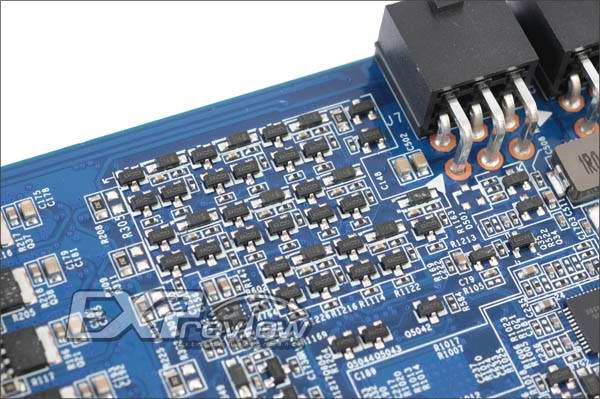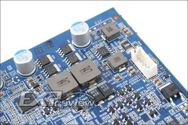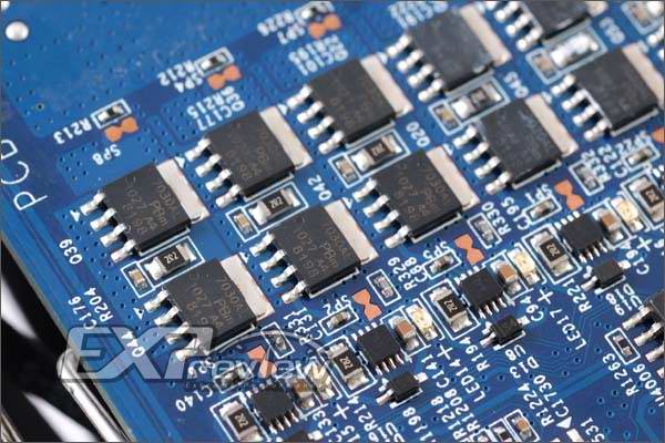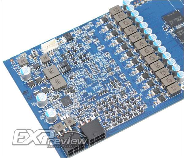 Официальная позиция разработчика такова - в карте используется 12-и фазовое питание графического ядра (и две фазы на память), на деле это не совсем так, правильнее назвать его "виртуально 12-и фазовым". Это следствие того, что чип PWM Semiconductor ADP4100 не может поддерживать более 6-и фаз, но Gigabyte применили SPDT чип, каким-то образом позволяющий это осуществить.
