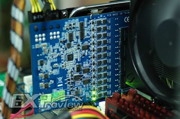 Уникальной особенностью карточки является наличие 12 зелёных светодиодов на обратной стороне печатной платы. На фотографии выше сложно понять где конкретно они находятся, однако позже Вы обязательно увидите их в действии.