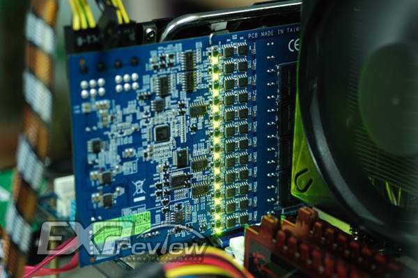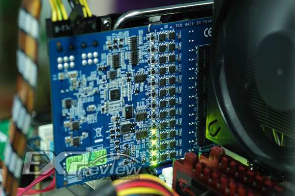 Светодиоды на обратной стороне видеокарты показывают степень нагрузки - чем больше лампочек горит, тем карта сильнее шпарит в данный момент. Автор статьи говорит, что светодиоды не будут работать без установленной программы OC Guru, хотя допускаю возможность, что я не так его понял, всё же перевод с китайского на английский, а затем на русский не самая точная наука ![]()