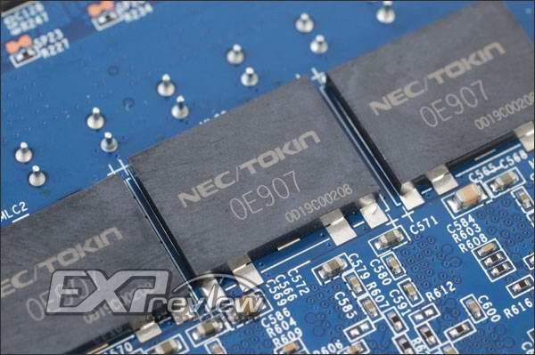 На фото выше изображены плёночные конденсаторы NEC/Tokin Proadlizer, благодаря которым карточка стабильно снабжается электричеством даже в экстремальных условиях работы.