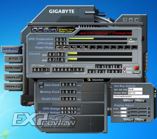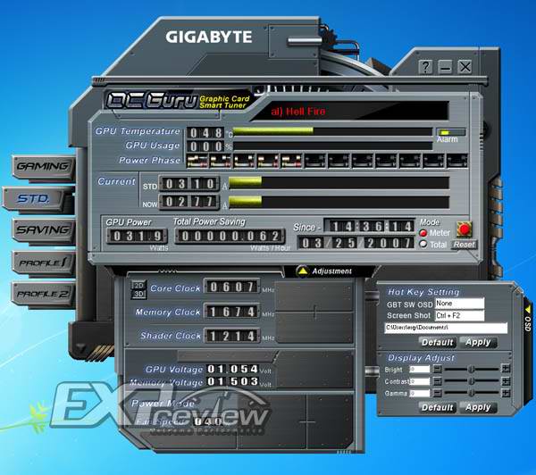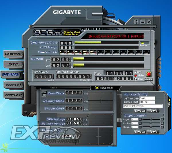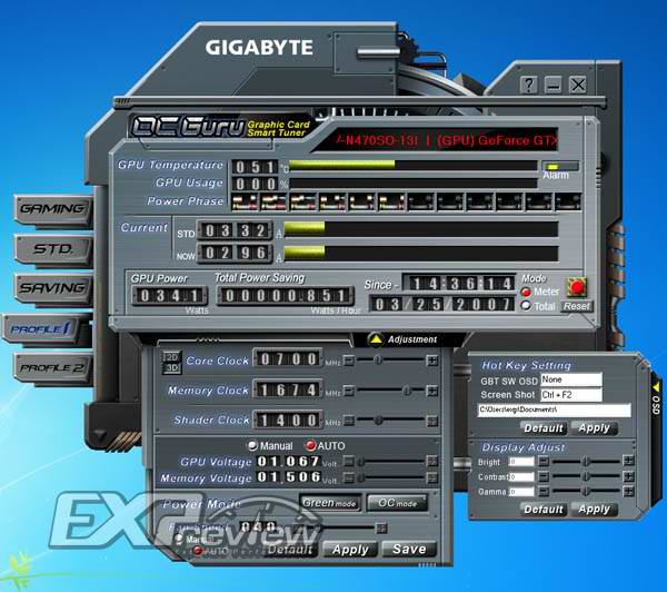 Возможности OC Guru довольно широки. Первое, что стоит отметить, это выбор пресета (заранее сохранённых настроек видеокарты). Имеются Game, STD и Saving. Первый - это игровой пресет, в нём карта будет шпарить по полной, дабы обеспечить самую высокую производительность, на которую она способна. STD, это сокращённое слово "Standart", в нём частоты карты и напряжение будут несколько меньше, чем в первом режиме (как у референсной модели GTX470). Ну а третий пресет создан для тех, кто следит за энергопотреблением своего ПК и не хочет, чтобы оно выходило за определённые рамки. В последнем режиме и частоты карты и напряжения значительно снижаются, но не до уровня 2D, конечно.