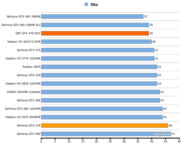 Гилберту с Guru3D карточка тоже приглянулась, к плюсам он отнёс тоже самое, что и автор обзора с Expreview. Однако по результатам его замеров, карточка разогрелась максимум до ~83 градусов (хотя к его методике измерений у меня есть вопросы, достаточно лишь посмотреть на график), а шум был всего 39 децибел против 46 у референсной карточки.