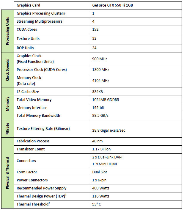 Если кто-то из Вас, уважаемые читатели, не знаком со спецификациями референсной GTX 550 Ti, то поглядите в табличку, расположенную ниже.