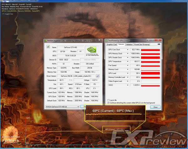 При помощи FurMark'а карточку как следует прогрели и когда температура зафиксировалась, сделали её замер. Итог - 68 градусов по Цельсию в нагрузке, напряжение на ядре поднялось до 1.037 вольт. Вентиляторы крутились на 49% своей скорости, шум от них китайским коллегам показался довольно назойливым. Страшно представить что будет на 100% их оборотов !