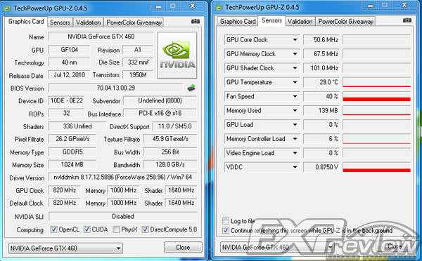 Итак, в простое карточка работает на пониженных частотах, этим нас не удивишь. Частоты падают до 50/101/270МГц, а напряжение понижается до 0.875 вольт. После пяти минут работы продукта Onda в простое, китайские обозреватели сняли показания с GPU-Z - температура оказалась 29 градусов. При этом вентиляторы работали на 40% своей скорости и их было слышно. При замерах комнатная температура была 24 градуса по Цельсию.