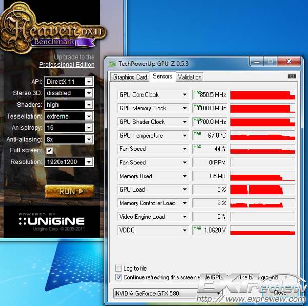 Для нагрузки карточки, использовался Unigine Heaven версии 2.5. Как видно по скриншоту выше, напряжение на ядре новинки поднялось до 1.062V, температура - до 67 градусов по Цельсию, а скорость вращения вентиляторов была зафиксирована (самой карточкой, не вручную) на отметке 44%. Шум от кулера был назван приемлемым.