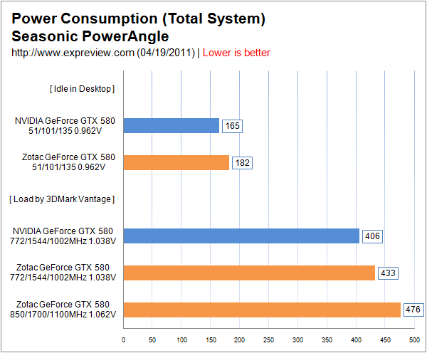 Для замеров прожорливости (имеется в виду, конечно, потребление электроэнергии) карточки, авторы использовали устройство Seasonic PowerAngel. Обычно, для того чтобы узнать максимальное энергопотребление решения, использовался FurMark, но в этот раз, по описанным выше причинам, сие стало невозможным и потому был задействован 3DMark Vantage. Потребление энергии в простое было проведено в режиме просмотра рабочего стола Windows 7 на протяжении 5 минут.
