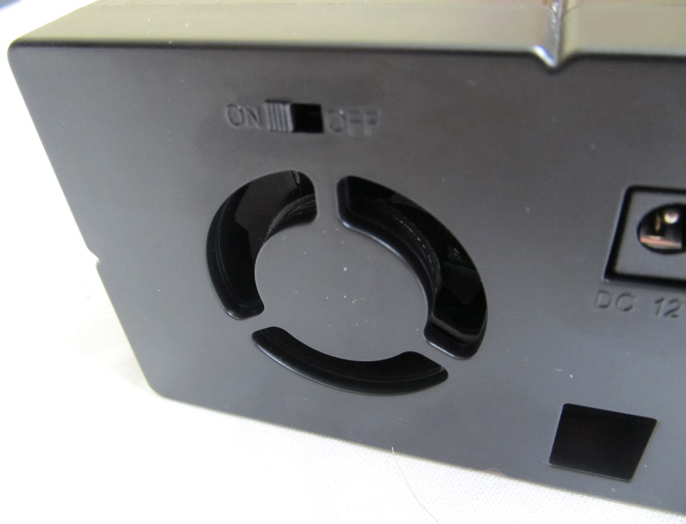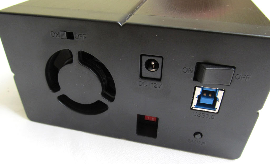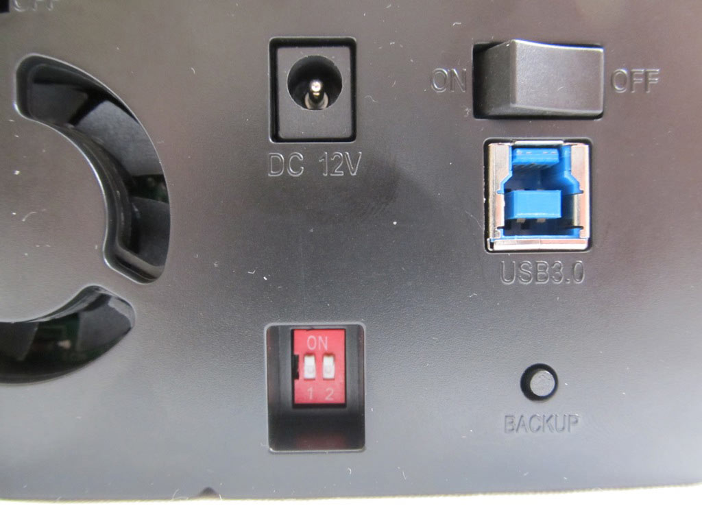 На задней панели находятся разъёмы для подключения питания и порт USB 3.0, кнопка включения/выключения, да кнопка Backup. С левой стороны расположены вентиляционные отверстия для выдува горячего воздуха, при дневном уровне шума вентилятор практически не слышно. Над отверстиями есть переключатель, позволяющий отключить вентилятор, но при частых обращениях к накопителям делать этого не рекомендуется.