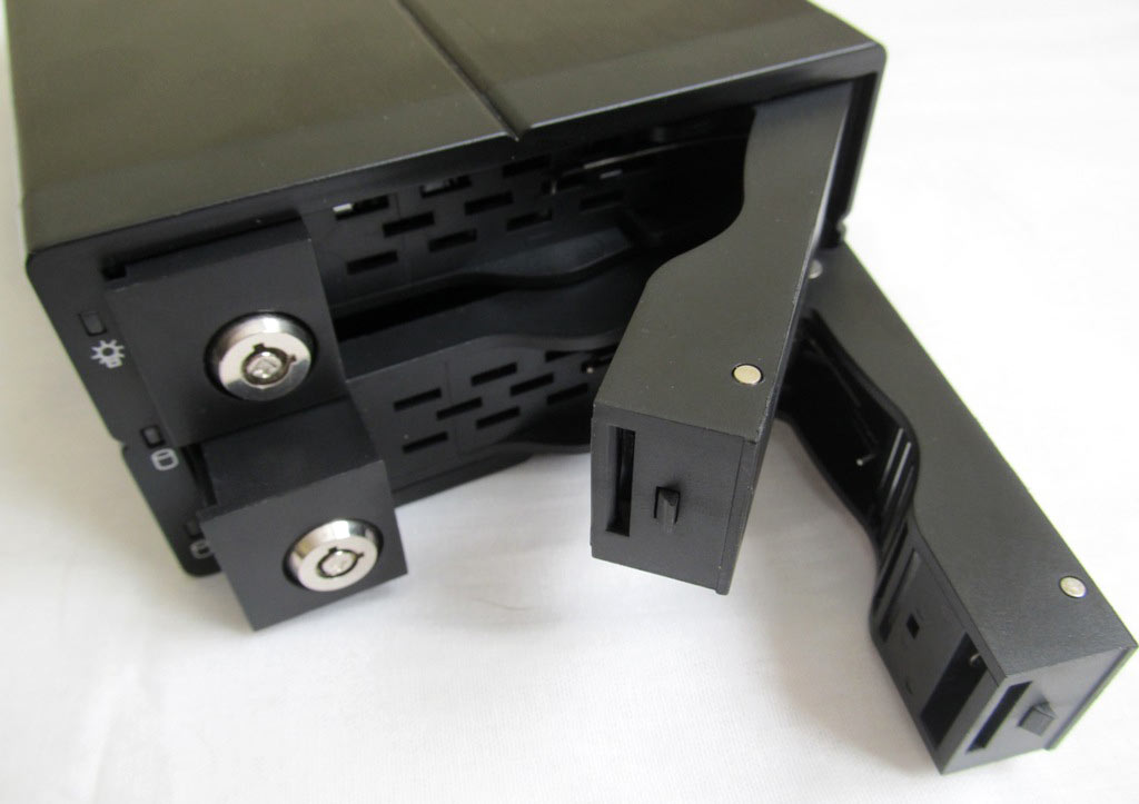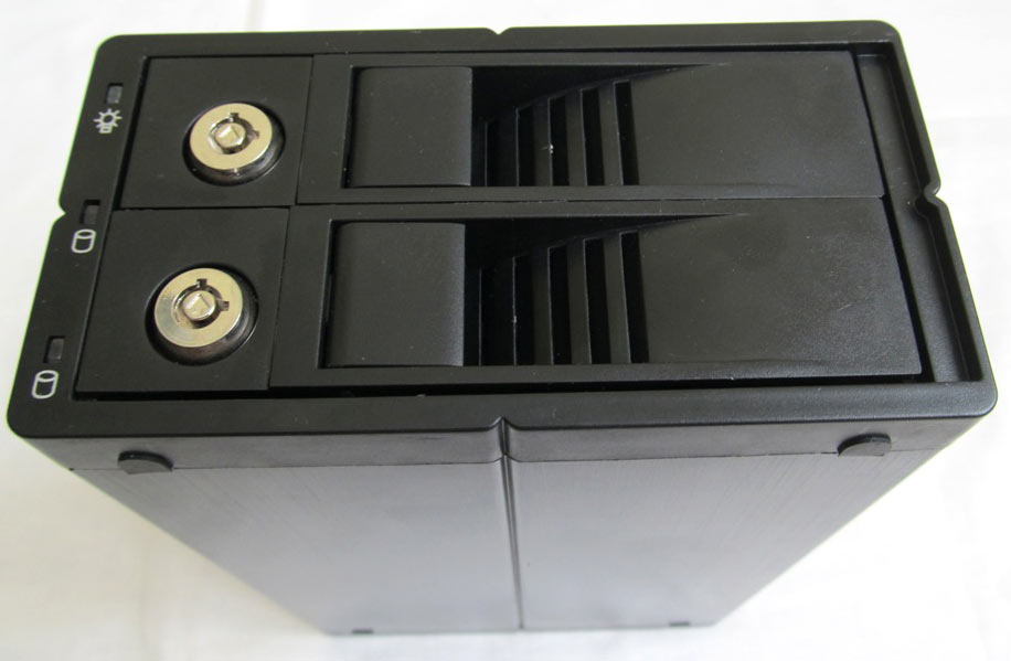 На передней панели расположились салазки для двух накопителей, на салазках имеется замок, но ключ от него в комплект поставки не входит, что достаточно странно. С левой стороны расположились индикаторы питания и активности накопителей.