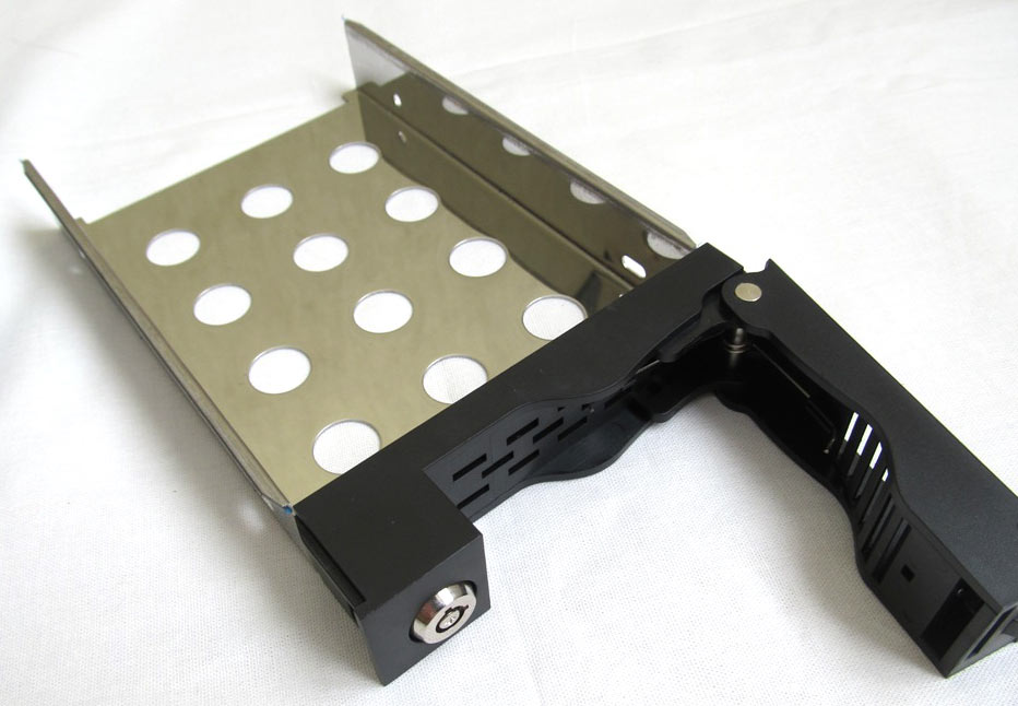 Для извлечения салазок, достаточно потянуть за ручку, основание салазок металлическое, накопитель к нему крепится 4 винтами.