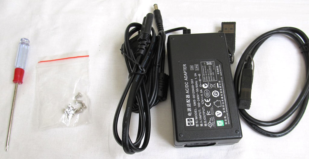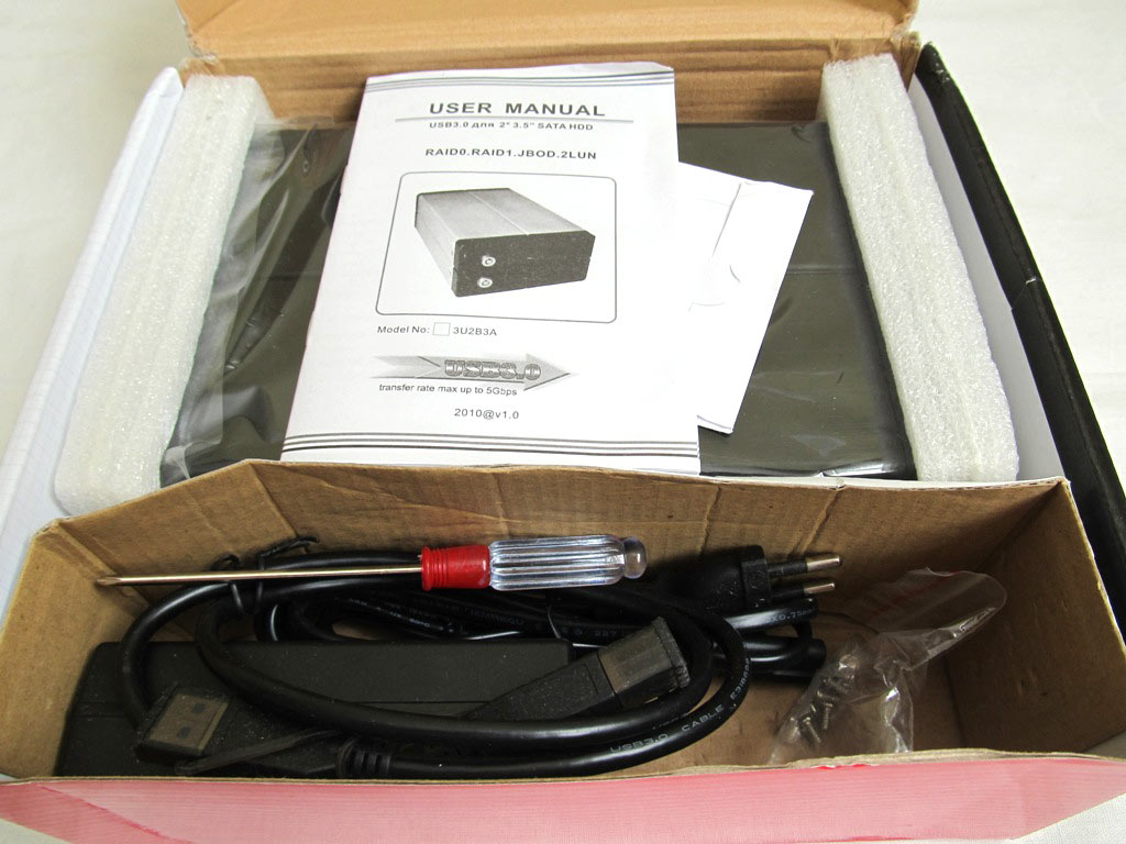 В комплект поставки входит руководство пользователя (на русском языке), блок питания, набор винтиков, отвёртка и USB 3.0 кабель (0,75м).