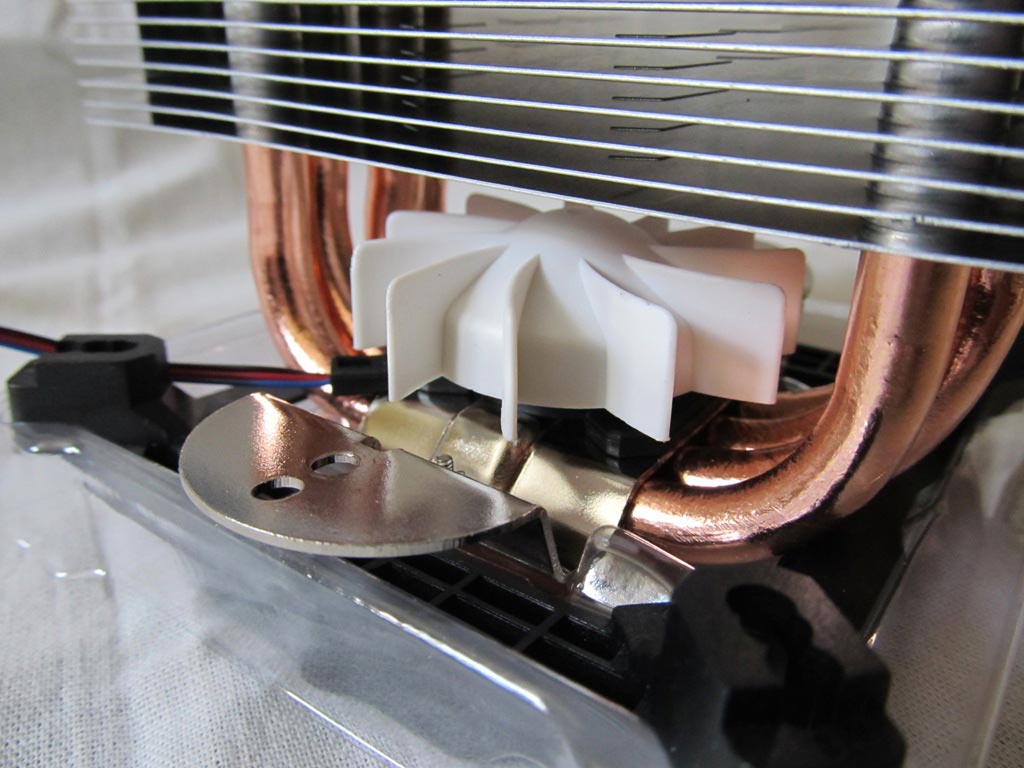 50мм вентилятор закреплён на основании кулера. При скорости вращения лопастей в районе 700 - 2700 об/мин, он будет хорошо обдувать элементы материнской платы в районе процессора.