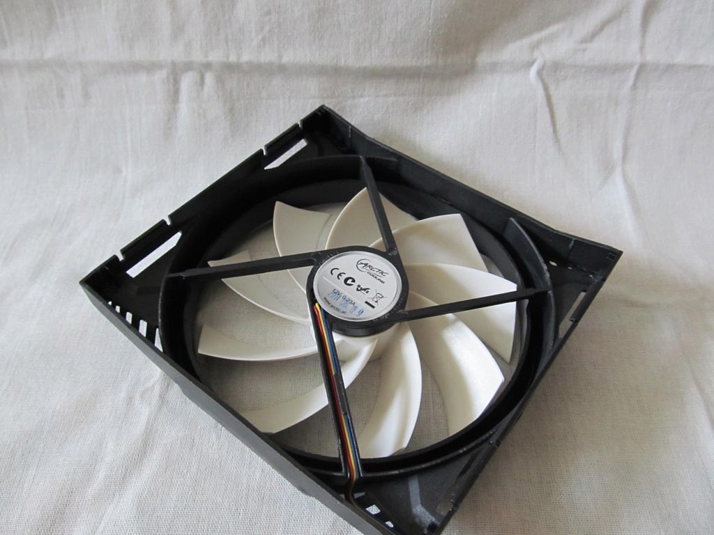 120мм вентилятор имеет 9 узких лопастей, которые вращаются со скоростью от 300 до 1350 об/мин. Вентилятор имеет нестандартную форму и заменить его на другой будет проблематично.
