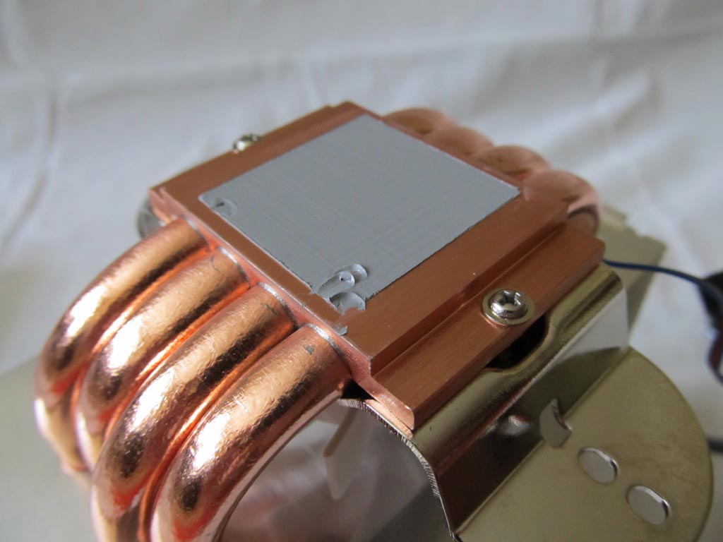 На медное основание производитель нанёс термопасту, можно не сомневаться в её качестве. Обратите внимание на тепловые трубки, находящиеся в желобках.