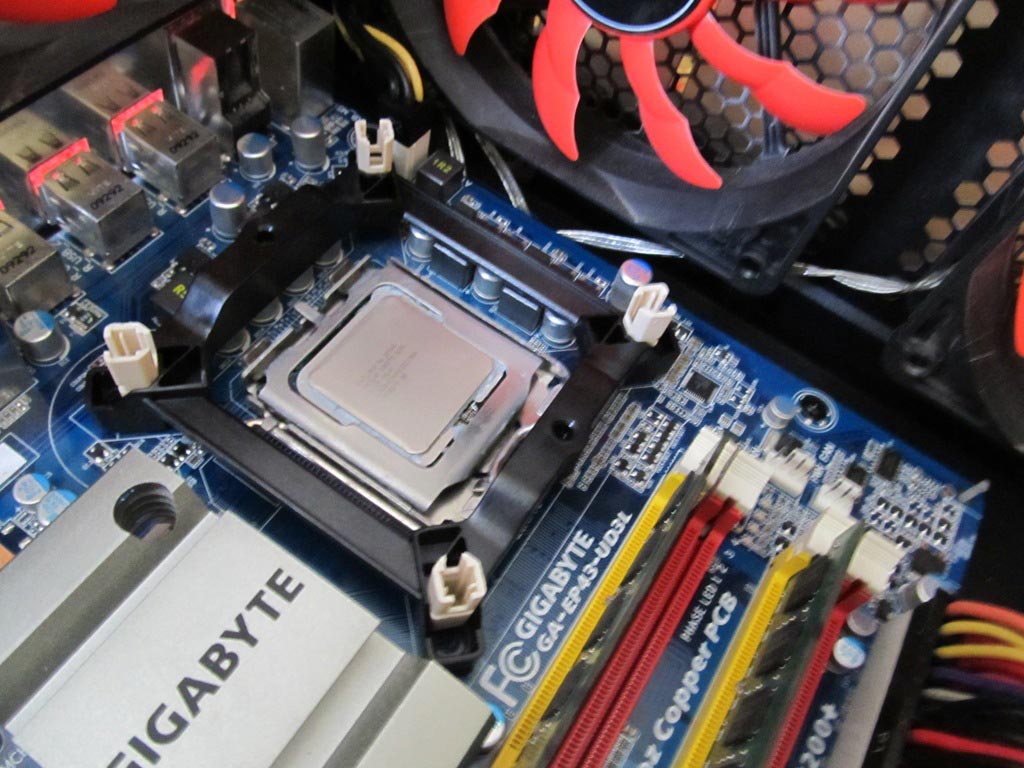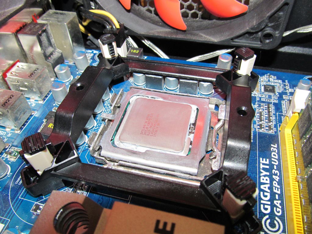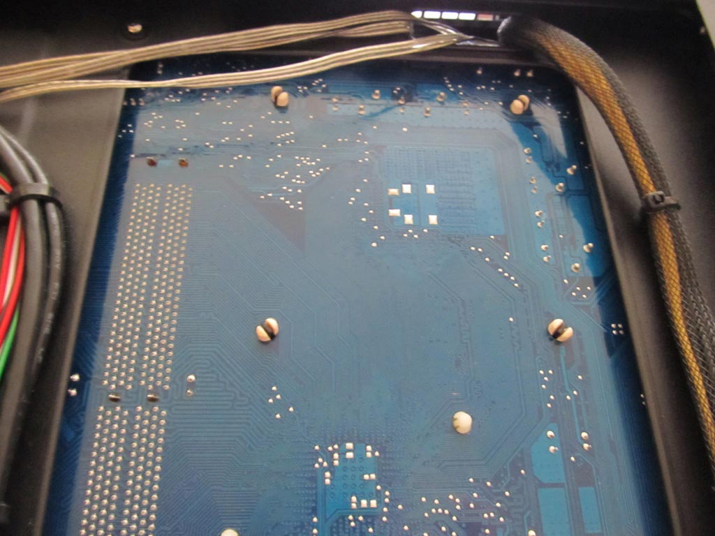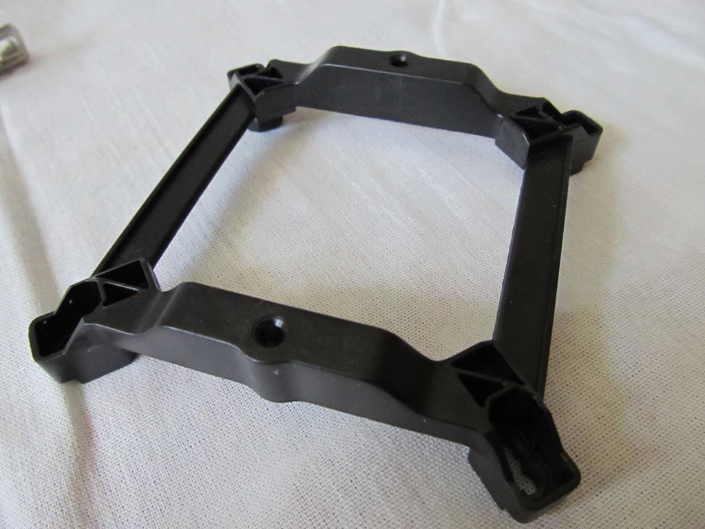 Для начала нужно установить …пластмассовые элементы… в отверстия по углам рамки, после чего эту конструкцию можно ставить на материнскую плату и вставлять чёрные гвоздики в эти …пластмассовые элементы… После установки переворачиваем плату и проверяем крепления.