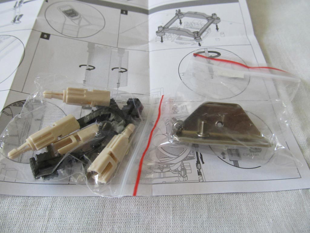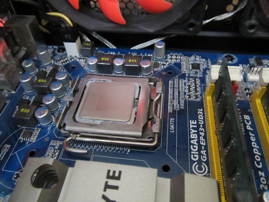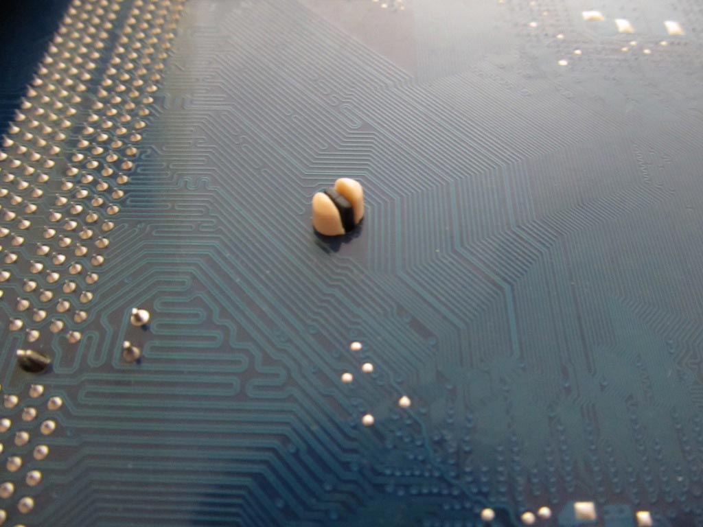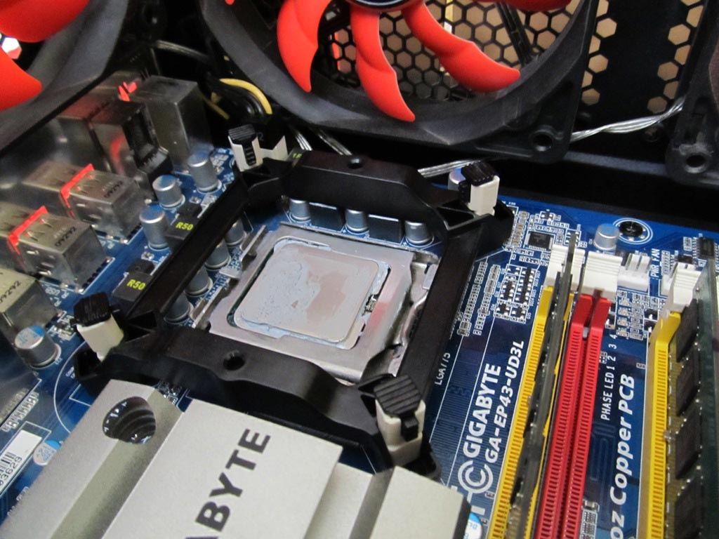 Для начала нужно установить …пластмассовые элементы… в отверстия по углам рамки, после чего эту конструкцию можно ставить на материнскую плату и вставлять чёрные гвоздики в эти …пластмассовые элементы… После установки переворачиваем плату и проверяем крепления.